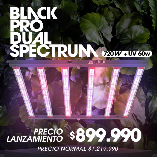 Imagina poder cultivar plantas vibrantes, flores más resinosas y frutos más potentes en menos tiempo y esfuerzo. Ahora imagina que, además, tienes el control total sobre cómo utilizar luz ultravioleta (UV) en tu cultivo. Con nuestro nuevo equipo Black Pro Grow Lights Dual Spectrum 720W + 60W UV, tendrás precisamente esa ventaja. Este equipo mantiene todas las ventajas del modelo 720W Pro, pero integra una línea adicional en cada barra de 60W de luz UV(Total) con control independiente, permitiéndote ajustar gradualmente la intensidad UV según el ciclo de cultivo. Ideal para áreas desde 120x120cm hasta 200x200cm². + CHIPS + PPFD + BALANCE SATURADO. *Equipos listos para envíos.
