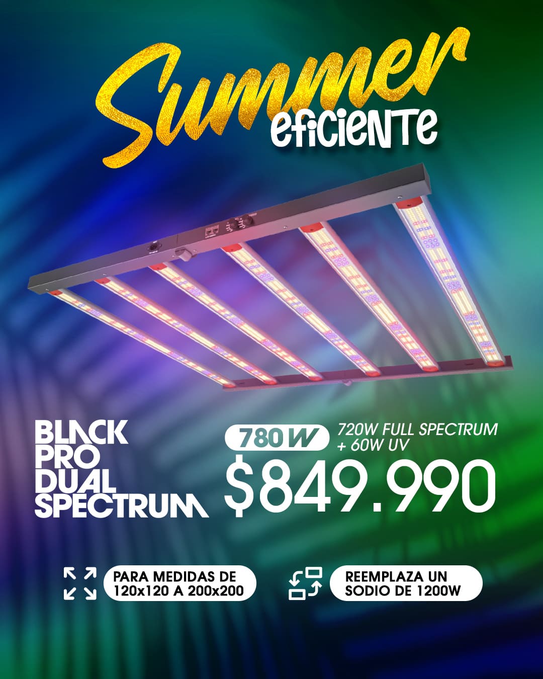 El Black Pro Dual Spectrum 780w Regulable combina 720W de luz Full Spectrum con 60W de UV-A regulable. Está pensado para espacios de cultivo grandes, con medidas cercanas a 120x120cm hasta 200x200cm, donde quieres buen reparto de luz, plantas mejor estructuradas y un plus en aroma, sabor y color cuando decides ocupar el canal UV.
