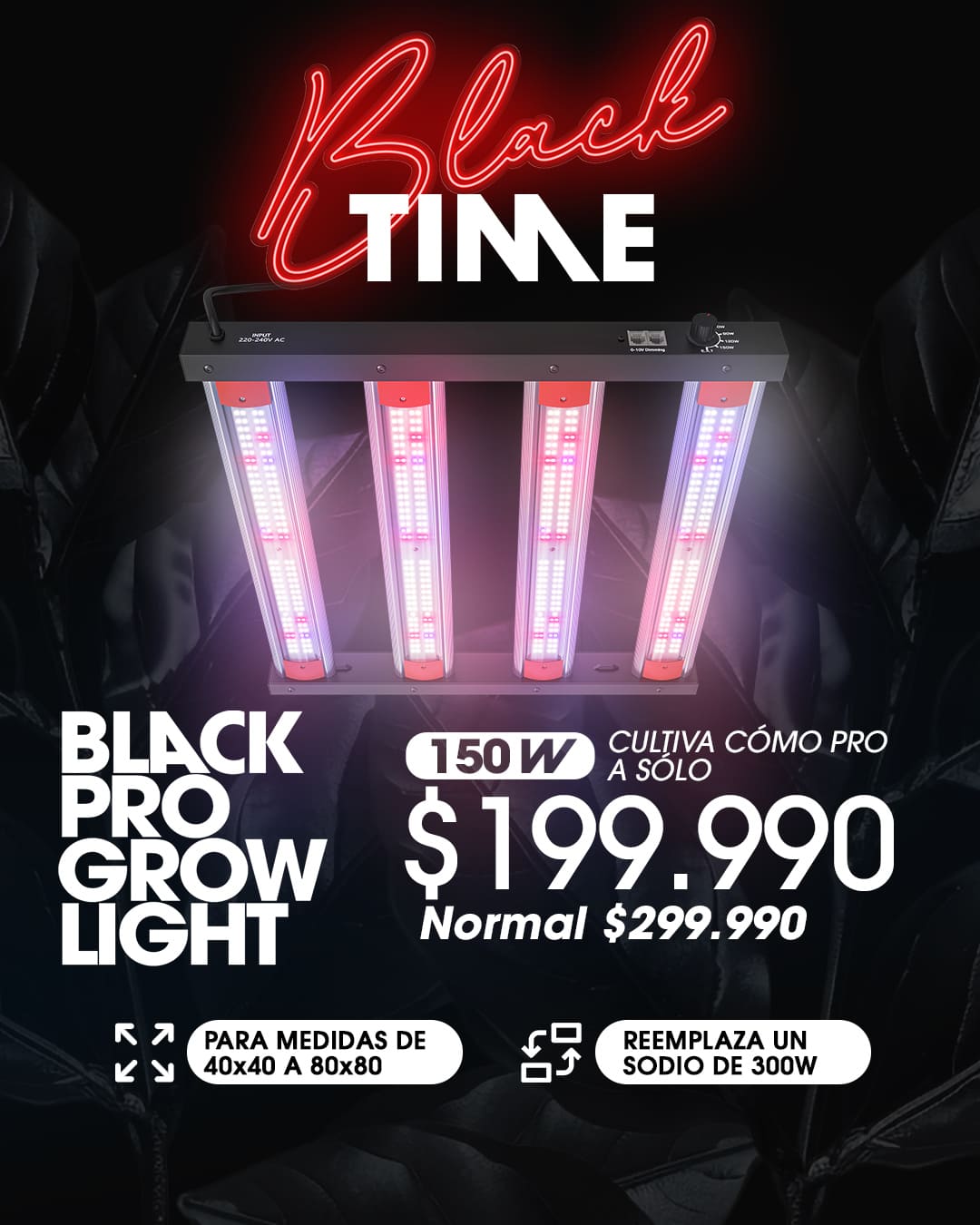 • Black Pro Grow Lights 150W Regulable con barras de alta penetración (4 líneas de chips por barra).