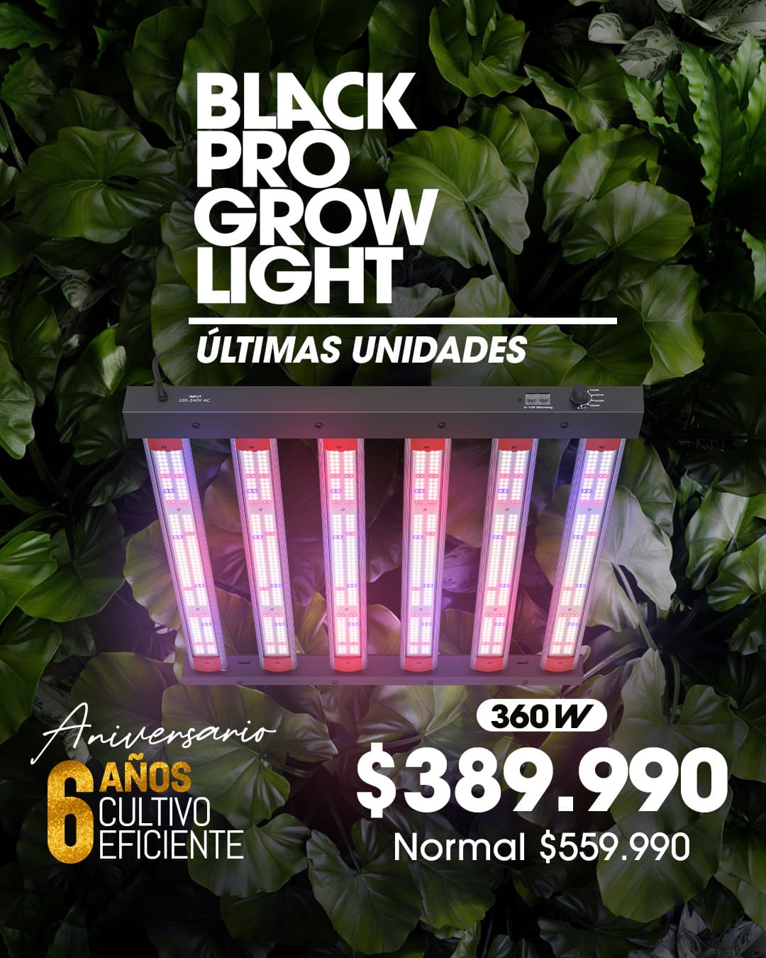 Imagina un cultivo lleno de vigor, vitalidad y productividad en espacios desde 60x60cm hasta 120x120cm². Las nuevas Black Pro Grow Lights 360W llegan con un espectro Pro saturado único en Chile, combinando semidiodos avanzados Osram Duris + Osram Oslon en una proporción perfecta de 5000K + 3000K + 450nm + 660nm + 730nm, generando un efecto Emerson saturado para un crecimiento explosivo.