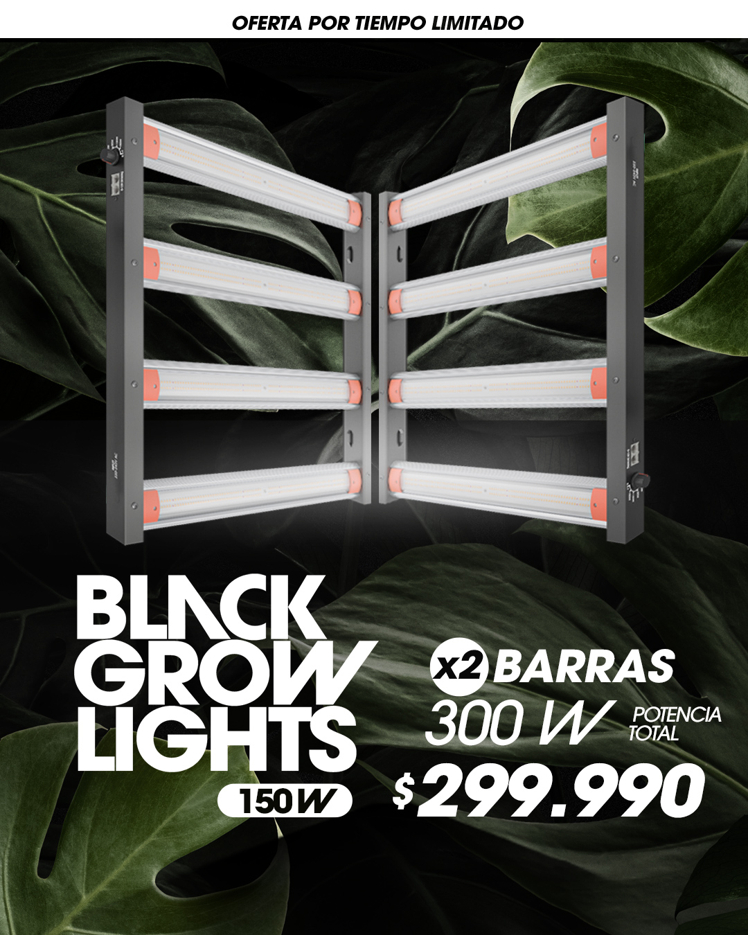 Si quieres iluminar tu cultivo de manera simple, compacta y eficiente, este pack x2 Black Grow Lights 150W es para ti. Con espectro completo 3500K + 660nm, regulación de potencia y un diseño robusto, tendrás todo lo que necesitas para un desarrollo óptimo en espacios de 40x40cm hasta 80x80cm. Perfectas para cultivos en casa, estas luces entregan la potencia justa en cada etapa y ahora puedes llevarte dos a un precio irrepetible.
